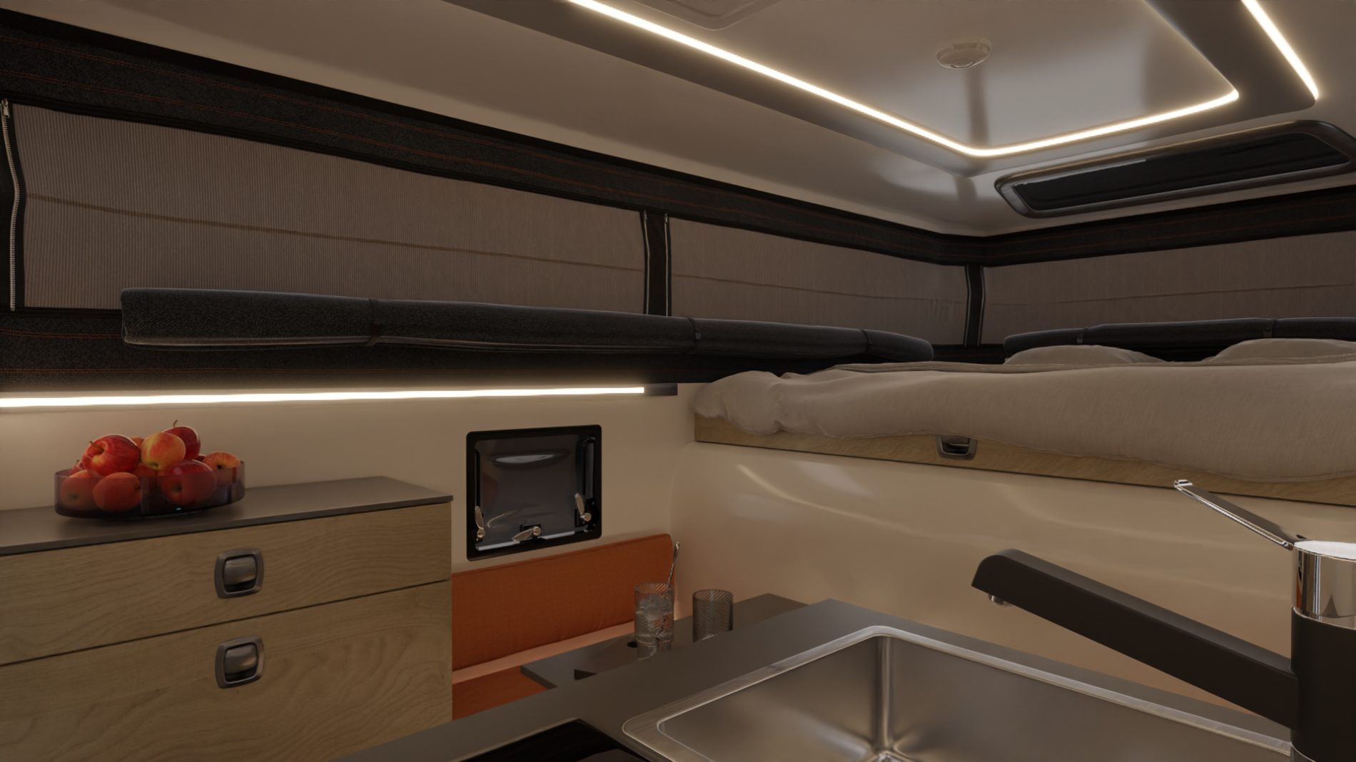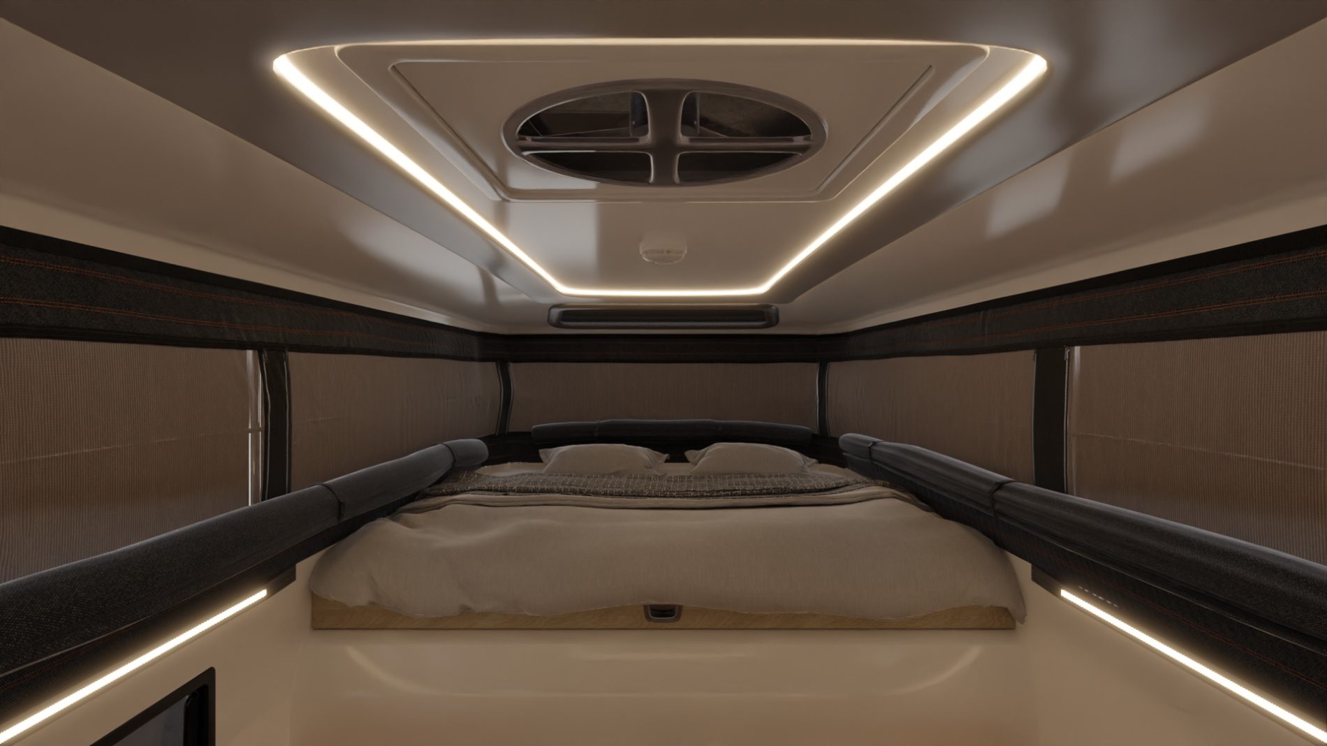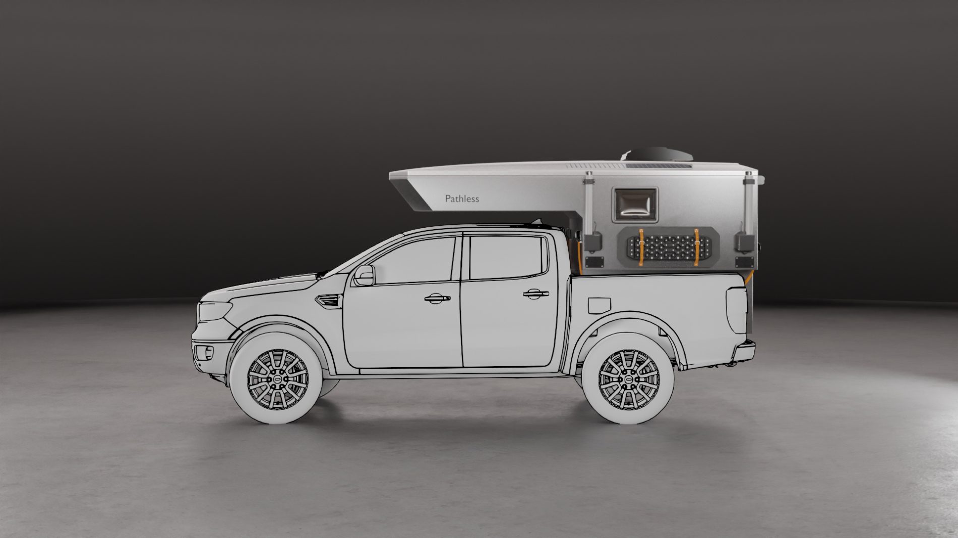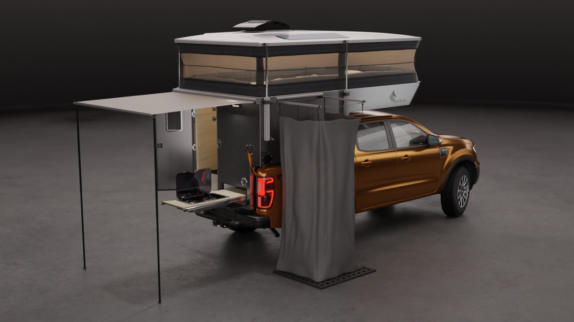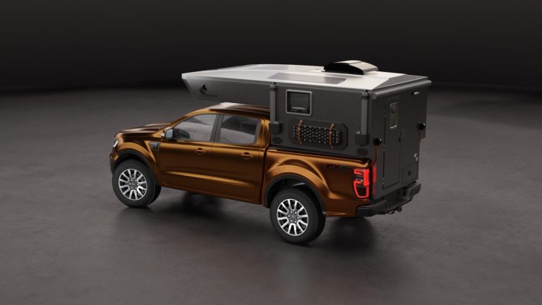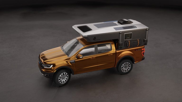 A premium, aerodynamic and low weight slide-in truck camper designed for mid-size pickups.